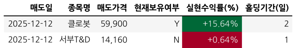 2일 전 로봇섹터 강세를 예상하고 매수했던 클로봇을 오늘 절반 수익 실현했다. 다른 로봇주들이 약해서 60,000원 맞고 내려오겠거니 했는데 한참 더 상승했다. 나머지 절반은 계속 홀딩할 계획이다. 로봇 행정명령 또는 CES2026 전까지.