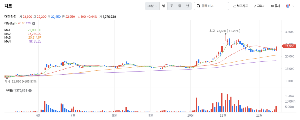 신규 매수한 종목은 전력 관련주인 대한전선이다. 대한전선을 매수한 이유는 차트상 앞서 있던 2-3주 정도의 매물을 돌파해줬기 때문이다.