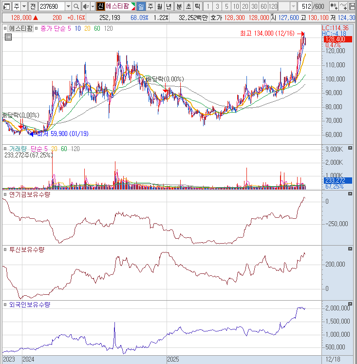 에스티팜은 120,000원의 전고점을 돌파하였고 약간 늦은 127,850원에 매수하게 됐다. 120,000원을 손절로 생각하고 있으며 신고가인 134,000원을 재돌파하면 다시 1UNIT 매수하여 피라미딩 예정이다. 에스티팜의 경우 요즘 계속된 실패로 1UNIT을 평소의 절반으로 낮춰 진입했다.
