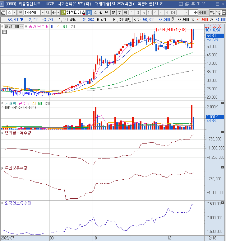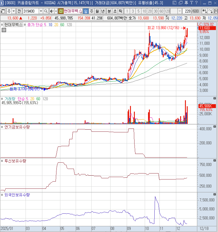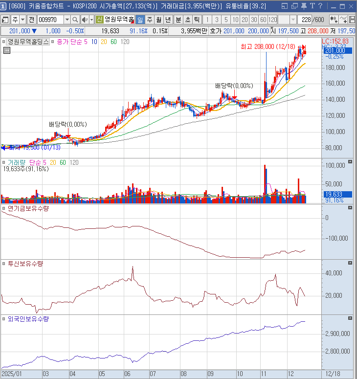 노스페이스 실적 상승에 관련된 영원무역홀딩스. 2025/11/07 슈팅에 음봉으로 매도 신호인데, 이때의 고점 매물을 착실히 소화해주는 모습에 매수, 그리고 오늘 추가 불타기로 최대비중으로 매수했다. 제2의 실리콘투가 될 수 있을 지 지켜보자.