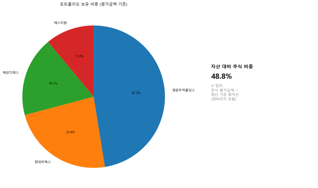 오늘은 매매내역은 올리지 않을 것이다. 너무 실망스럽기 때문이다. 대신, 포트폴리오 현황으로 복기한다. 지금은 자산 대비 주식이 48.8%에 불과하다. 나머지는 모두 현금이다. 주식 마저도 테크 종목은 없다. 소비재(영원무역홀딩스), 바이오(에스티팜), 현대무벡스(로봇)이다. 모두 실적이 호전되거나 호전될 것으로 기대되는 종목이다.