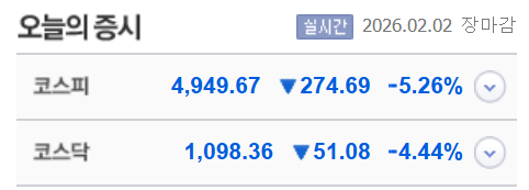 드디어 올 것이 왔다. 2026년 1월 엄청난 슈팅이 나와 필연적으로 조정이 있을 줄은 알았지만, 내심 연속된 모멘텀을 기대하고 있었다. 추세추종러로써 추세가 유지되는 한 홀딩하자는 마인드로 버티고 있던 터라 더 기대가 컸던 것 같다. 그런데 시장은 여지 없이 하락했다.
