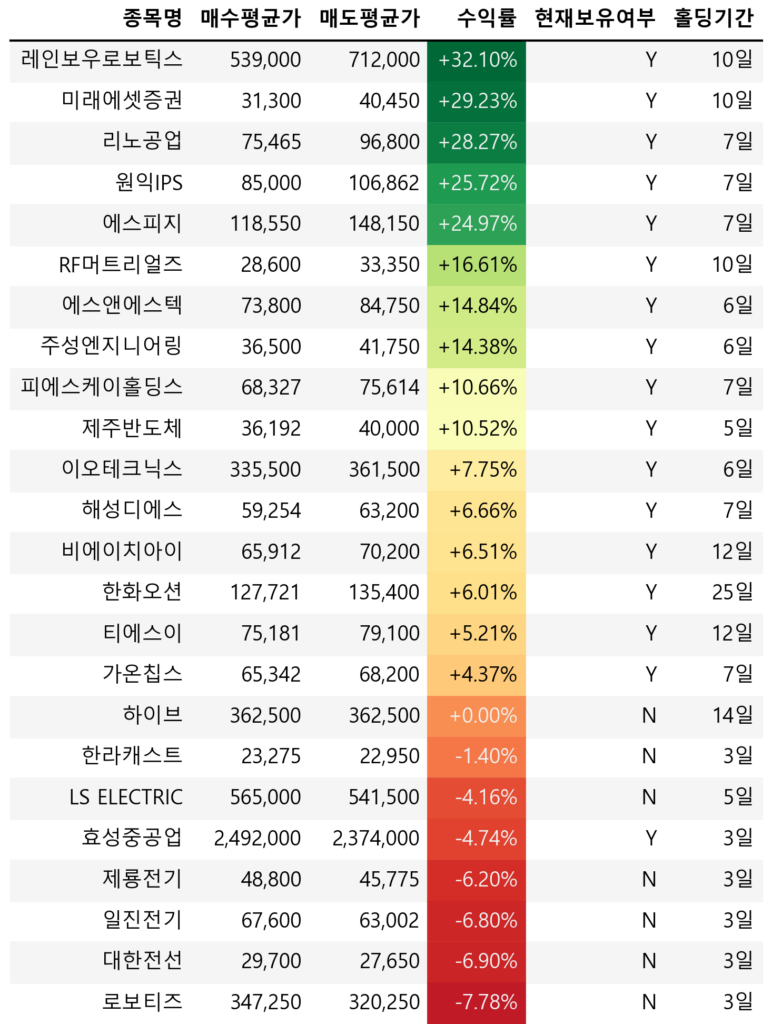 매도 종목이 아주 많다. 기본적으로 AI와 반도체, 로봇에 대한 익스포져를 줄였다. -7 ~ -8%가 넘어가는 것들은 손절했고 추세를 깬 것으로 판단되는 종목도 매도(익절)했다.