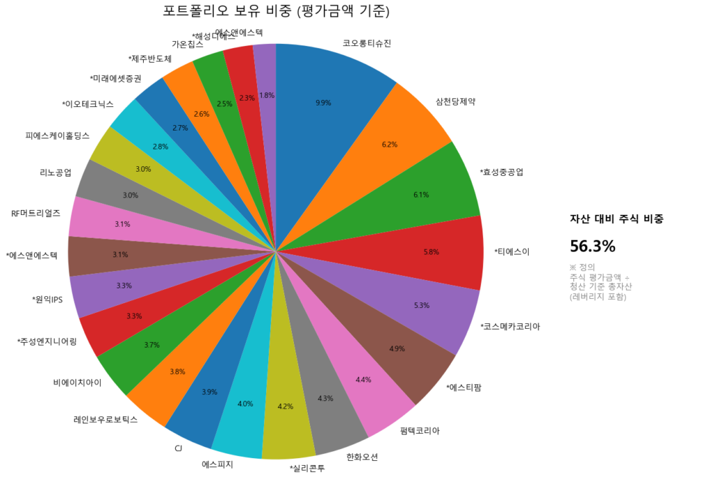 너무 보수적일 수도 있는데, 현재 주식의 비중은 포트의 56.3%이다. 바로 지난번만 해도 120 ~ 140%이었는데 주식 비중을 정말 많이 줄였다. 갑자기 반등하더라도 FOMO가 없을 것 같은 최소한의 비중이다. 바이오와 화장품의 경우 반도체 조정 시마다 수급이 유입됐기 때문에 비중을 전혀 줄이지 않았다. 오히려 약간은 비중이 늘어난 것처럼 보이는데 포트에서 주식의 비중 자체가 줄었기 때문이다.