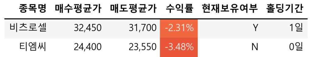오늘 아침에 곰곰히 생각해보니 비츠로셀은 전쟁 관련주라고 생각할 수 있겠다 싶어서 절반 매도했는데, 매도한 뒤로 꽤 준수한 상승을 줬다… 후회 중… 그리고 매도한 자금의 일부를 사용하여 티엠씨를 샀는데, 이놈이야말로 유가 관련 테마가 조금 섞여있다보니 주가가 크게 가질 못했고, 결국 적당한 선에서 손절했다. 정말 다행인 건 어제 매수한 대부분의 종목을 매도하지 않고 끝까지 홀딩한 것이다.