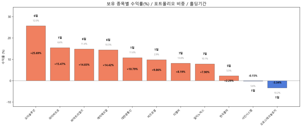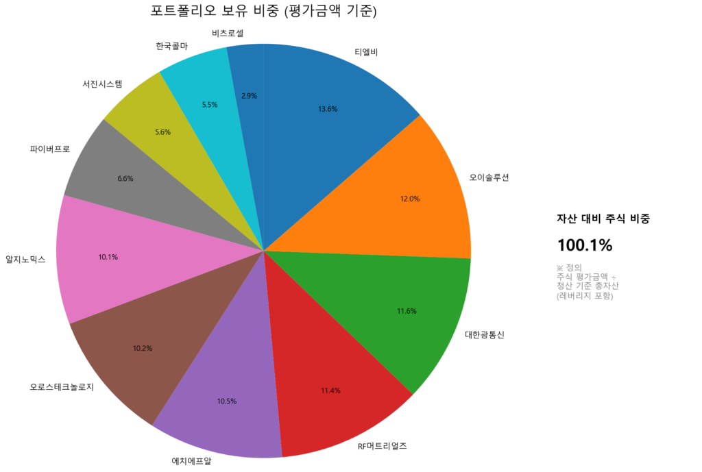 주식 비중은 대략 100.1%다. 아마 오늘 내로, 오로스테크놀로지를 조금 매도하고 한국콜마를 추가 매수하지 않을까 생각한다. 고민 중이다.