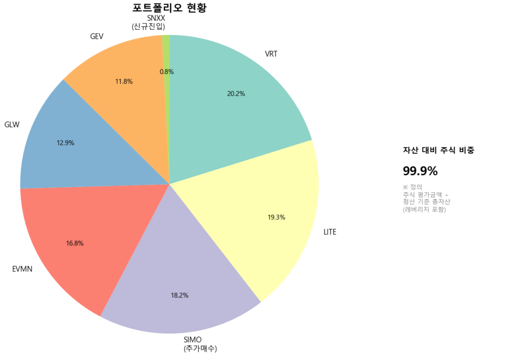 SIMO를 추가매수해서 포트 내 기준 비중이 3위가 됐다. SNDK 두배 추종 ETF인 SNXX도 조금 샀다. 티도 안나지만, 나중에 2배 레버리지 전략을 구사할 때 도움이 될 것 같아 진입했다.