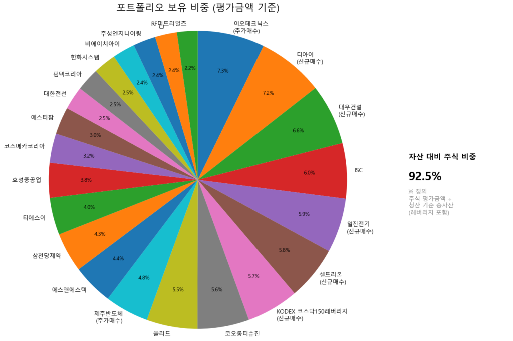 신규매수 종목들의 비중이 비교적 커보인다. 이유는 이제 정석적으로 1UNIT을 딱 매수하기로 했다. 그리고 주가가 상승하면 1유닛을 더 매수 한다. 장이 좋지 않으면 0.5유닛이나 그 이하로 비중을 내릴 계획이지만 아직은 1UNIT으로 매수 기준을 유지한다.