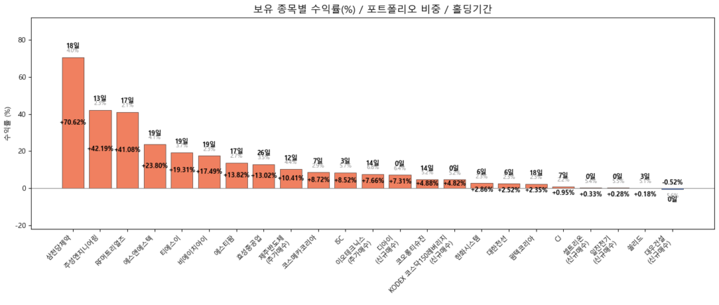 보유 종목별 수익률이다. 삼천당제약이 하늘 높은 줄 모르며 계속 오르고 있어 수익률이 상당하다. 나머지도 대부분 수익권이긴 한데, 아슬아슬한 수준이다. 내 전략은 시스템 트레이딩을 통해 적극적인 불타기, 그리고 불타기에 힘 입은 수익금 최대화에 있다.