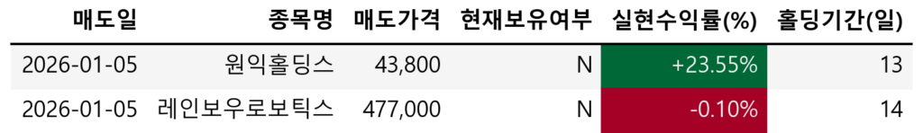 로봇 테마의 셀온으로 가지고 있던 두 로봇 종목을 매도했다.