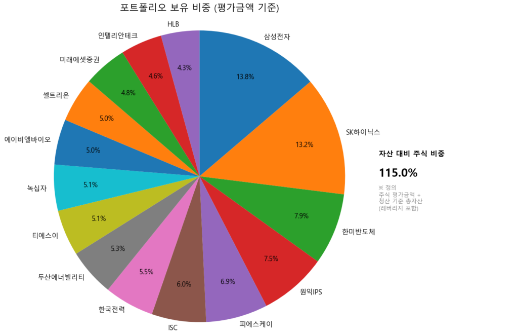 주식 비중은 115%이며, 한국전력과 두산에너빌리티를 신규 매수했다.