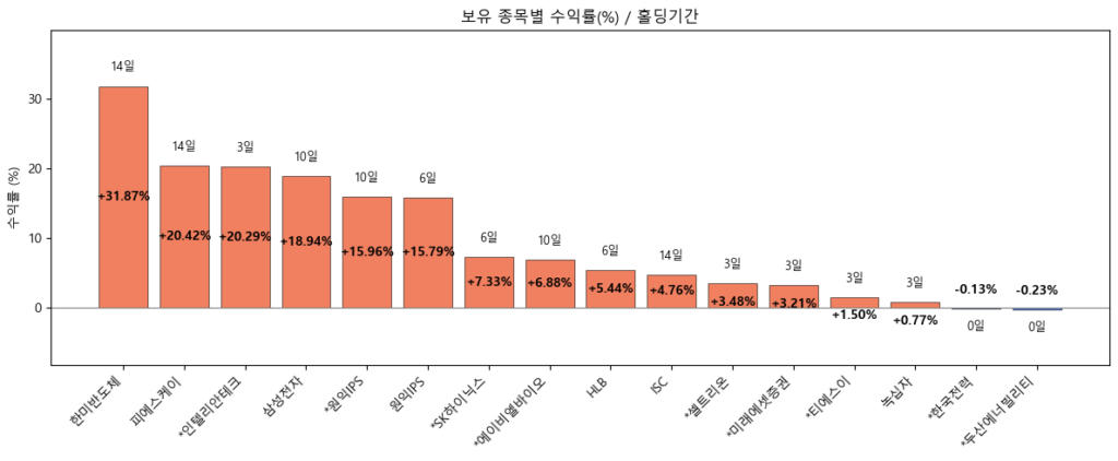 반도체 주도 장세에서도 예상대로 제약, 바이오 종목이 꽤나 잘 올라주며 수익률을 위로 이끌어주었다.