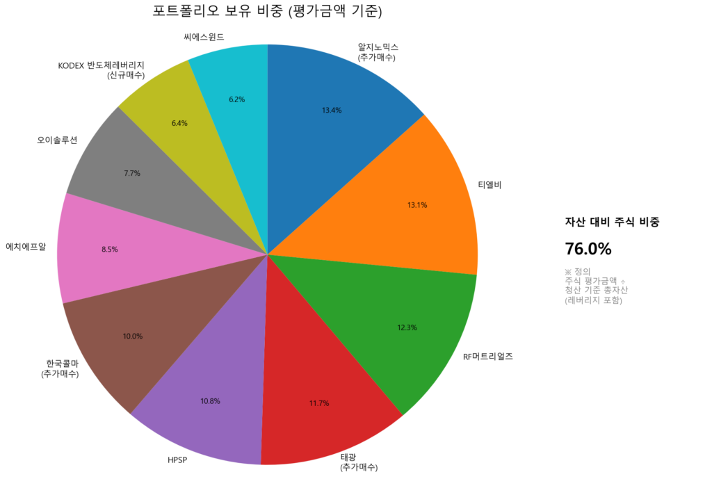 주식 비중은 76%다. 어려운 장에서도 강한 모습을 보였고, 또 전쟁이 소강상태로 들어간다고 해도 하락하지 않을 테마 종목을 추가 매수했다. 태광과 알지노믹스, 그리고 한국콜마다. 또한 내일 아침, “트럼프의 타코” 또는 “악재 소멸” 어떤 식으로든 시장이 반등할 것으로 판단되어 반도체 레버리지를 일정 부분 눌림에서 매수했다.