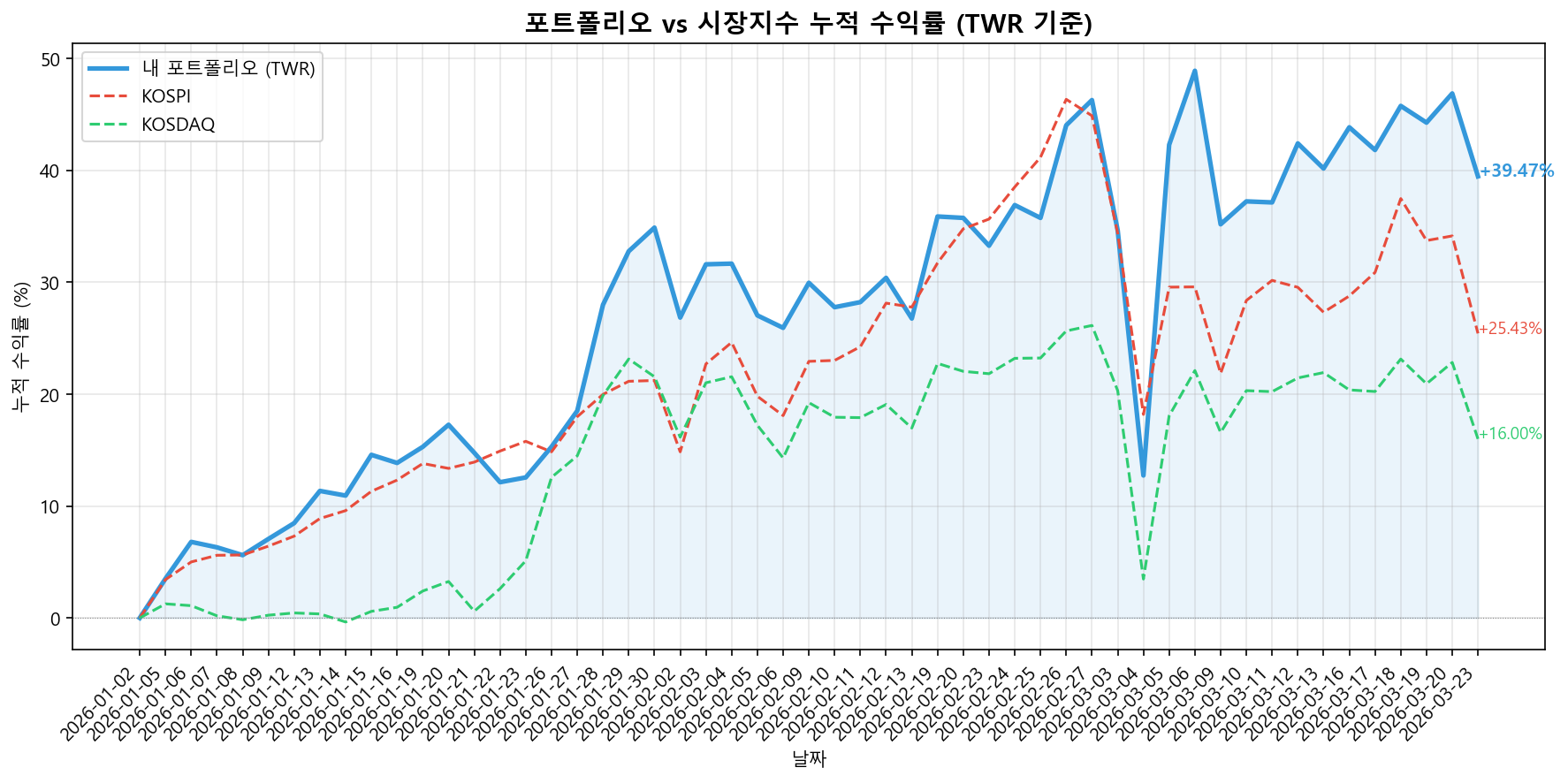 주식 비중은 76%다. 어려운 장에서도 강한 모습을 보였고, 또 전쟁이 소강상태로 들어간다고 해도 하락하지 않을 테마 종목을 추가 매수했다. 태광과 알지노믹스, 그리고 한국콜마다. 또한 내일 아침, “트럼프의 타코” 또는 “악재 소멸” 어떤 식으로든 시장이 반등할 것으로 판단되어 반도체 레버리지를 일정 부분 눌림에서 매수했다.