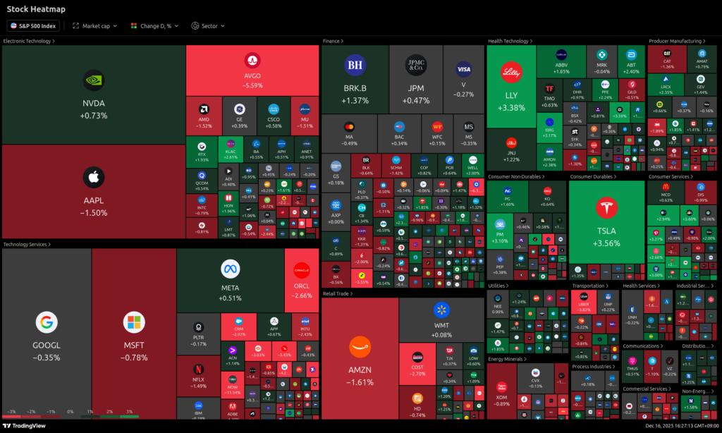 어제 미장은 -0.59% 하락했다. 하락장 덕분인지 AI테마에서 빠져나온 자금의 섹터 로테이션이 돋보인 하루였다. 위의 히트맵을 보면 자금의 흐름을 쉽게 볼 수 있다. 반도체, 테크 즉, AI관련주들로부터 자금이 빠져나와 바이오와 소비재, 그리그 금융으로 가는 모습이다. 오라클 발 AI과잉투자 우려가 하루만에 끝나지 않을거라 베팅하며 예상했던 부분이 정확히 맞아떨어진 것이다. 앞으로도 이런 흐름이 지속되지 않을까? 오늘, 내일 정도에 미국 증시에서 작은 반등이 나올지는 모르겠지만, 적어도 한동안 이렇게 우울한 분위기가 계속될 거라 생각한다.