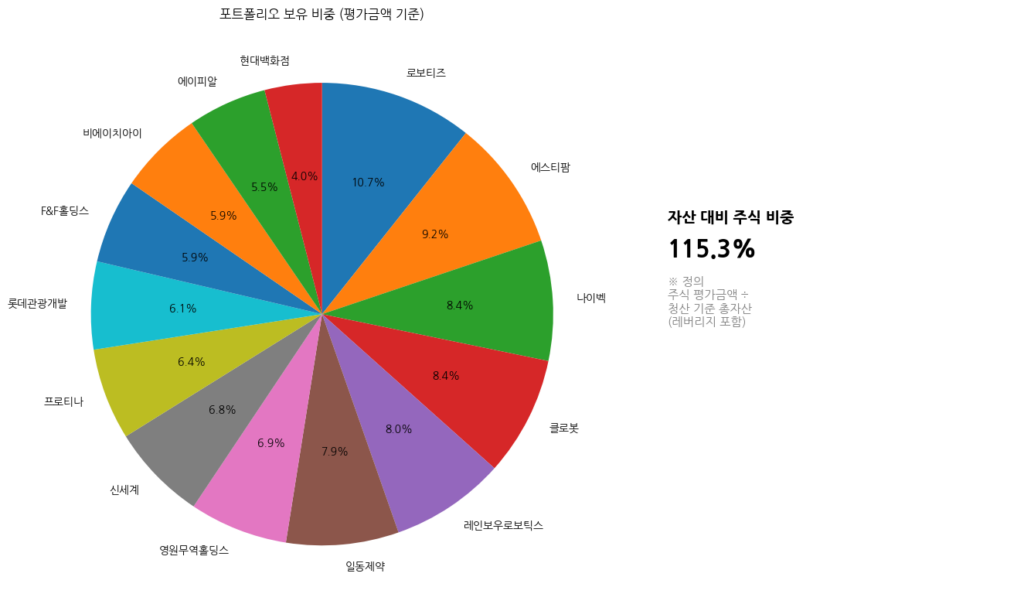 클로봇과 비에이치아이, 일동제약을 조금 더 매수하여 비중이 늘었다. GEV의 주가가 하락장에서도 잘 버텼고, 국내 원전 및 가스터빈 관련주들이 좋은 흐름을 보여줬기 때문이다. 그리고 미련인지는 모르겠지만 아직 로봇에 대해 희망을 가지고 있다. 클로봇을 더 매수한 이유다.