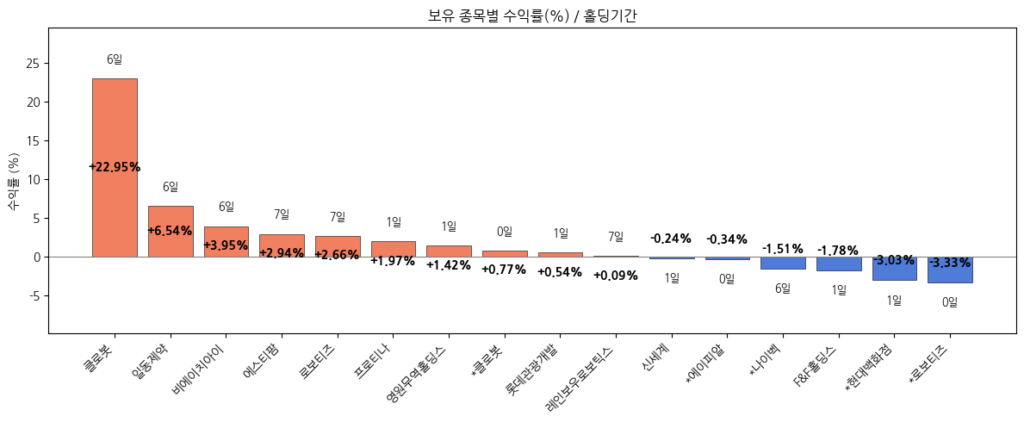 *표시는 신용으로 매수한 물량이다. 로보티즈, 레인보우로보틱스가 큰 폭으로 하락하며 포트폴리오의 수익률을 떨어뜨렸다. 그리고 운이 없게도(?) 우리나라 주식 시장에서는 순환매가 크게 일어나지 않았다. 상승한 섹터가 화장품 외엔 명확치 않았다. 시장의 조정을 예상하고 맞췄음에도 큰 수익을 내지 못한 핑계다.