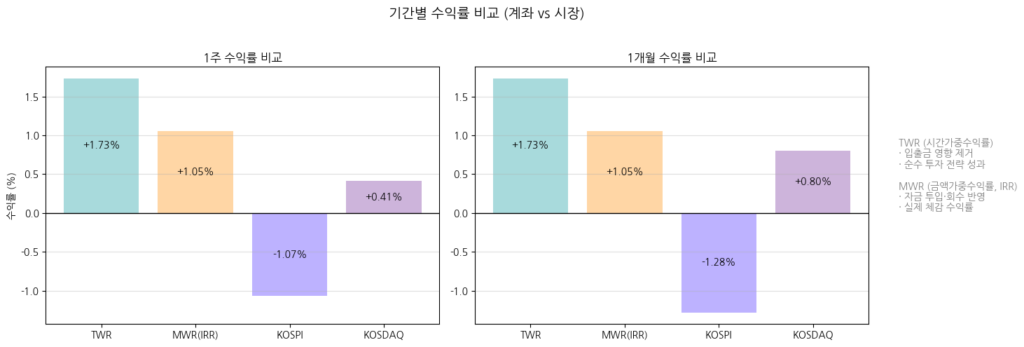 국내주식 추세추종을 시작하고 포트폴리오 수익률이다. TWR과 MWR로 비교하고 있다. 기록을 시작한지는 1주일 정도 됐으므로 좌측과 우측의 수익률이 같다. 장기간 비교해보는 것도 흥미로운 일이 될 것 같다. 이렇게까지 하는 이유는 한가지 전략을 꾸준히 추구하기 위함이기도 하다.