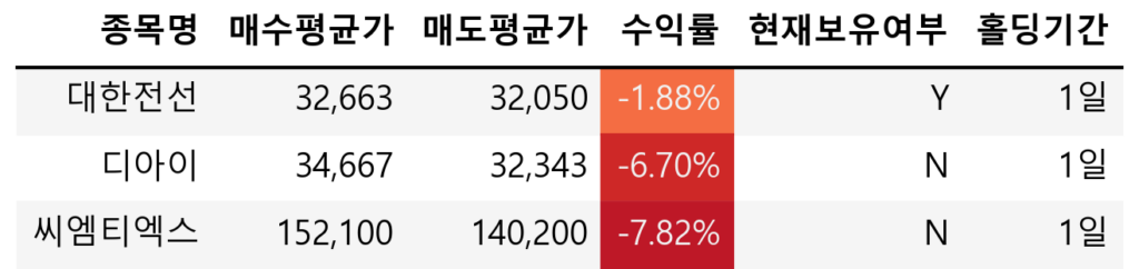 오늘의 큰 하락으로 대한전선의 비중을 줄였고, 기존의 상승률이 낮았던데다가 오늘 크게 하락한 디아이와 씨엠티엑스를 매도했다.