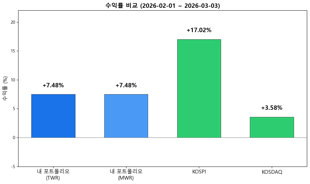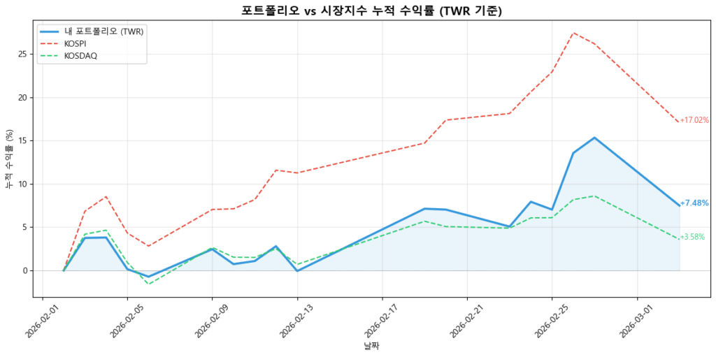 오늘 하루 레버리지로 포트 자산이 코스닥의 하락 대비 크게 하락했다. 다행히 2/1부터 계산했을 때 아직은 수익이다. 그러나 앞으로는 보유 종목 수를 보다 축소할 것이므로 시장 대비 수익률 괴리가 커질 예정이다.