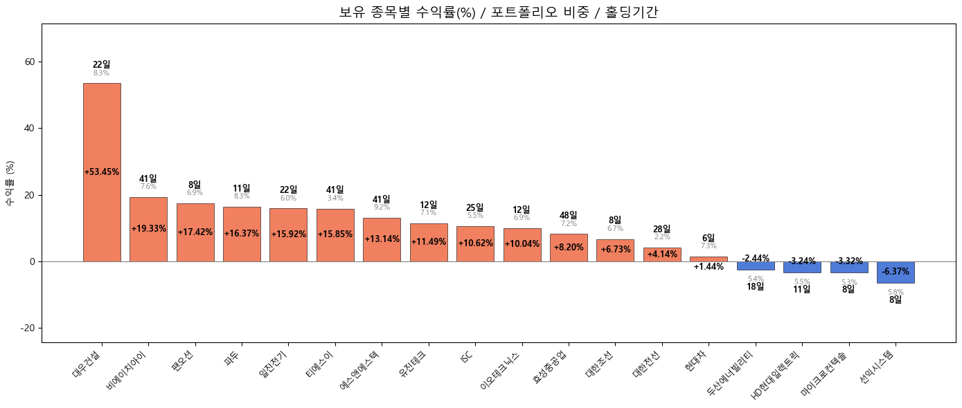 보유 종목을 보면, 그럭저럭이다. 보유 종목의 수가 많이 줄었다. 앞으로도 정말 많아야 20종목, 가급적이면 10종목 내외로 관리해볼 계획이다. 펀더멘털에 조금 더 많은 비중을 두고 매수할 것이기 때문이다.