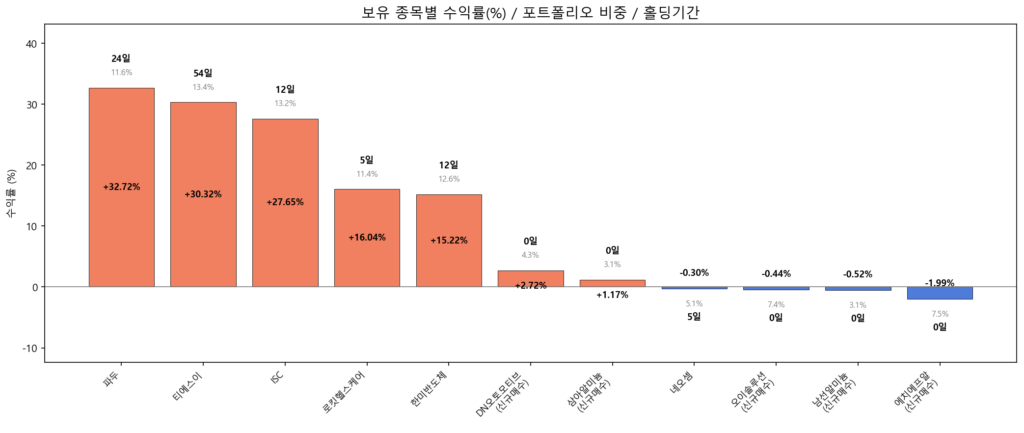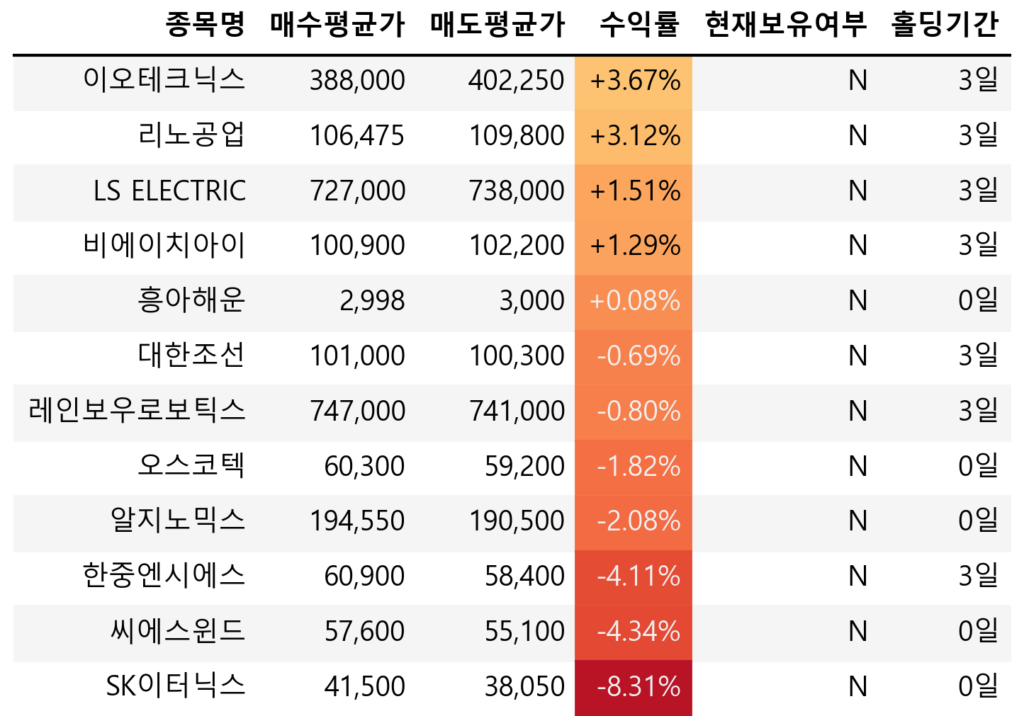 한중엔시에스가 약한 모습을 보여 매도했고, 레인보우로보틱스도 오전에 장이 좋지 않아 빠르게 매도했다. 이오테크닉스와 리노공업, LS ELECTRIC, 비에이치아이도 계좌의 회전율을 높이고 더 좋아보이는, 당장 거래대금이 터지고 인더스트리 액션이 나오는 등, 기회비용이 적은 종목들로 교체하기 위해 매도했다. 홀딩기간이 0일인 종목은 거의 1주만 모니터링 목적에서 매수했다가 매도한 경우가 대부분이다.