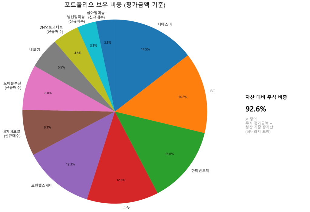 레버리지를 줄여 주식 비중은 92.6%이다. 새롭게 편입한 종목은 에치에프알과 오이솔루션이 비교적 큰 비중이다. 통신주가 강세를 보이다가 오늘 첫 조정으로 내 포트 편입 기준에 충족됐고, 엔비디아 GTC등 통신주들이 부각받을 이벤트가 많다는 판단에서 매수했다.
