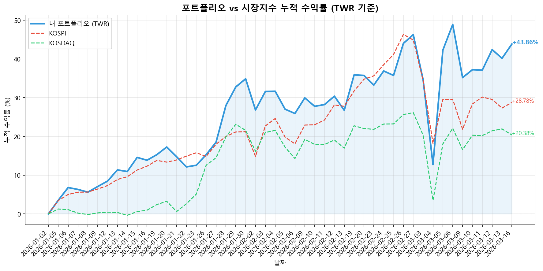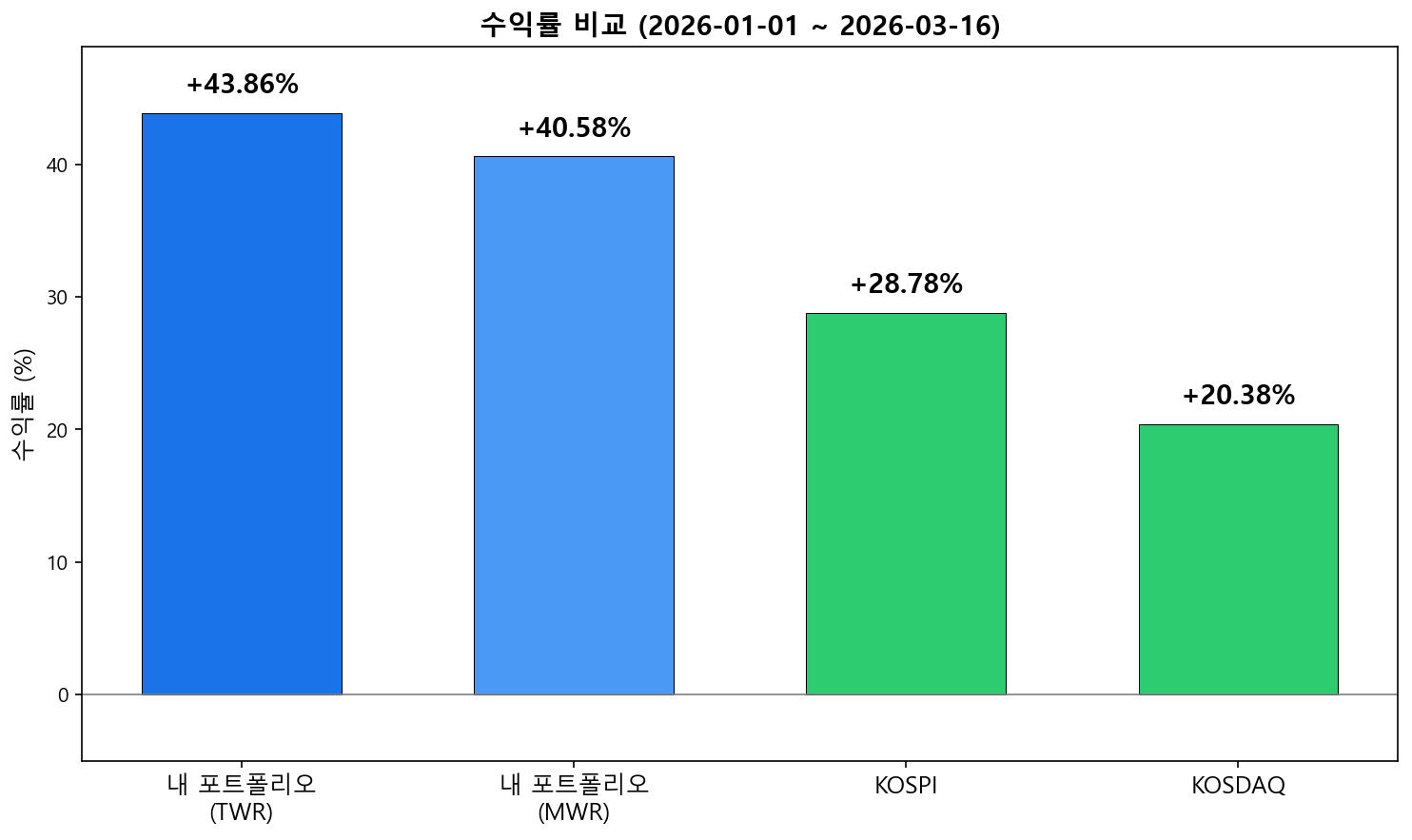 남선알미늄과 삼아알미늄은 이란 전쟁으로 인한 알루미늄 공급 차질 이슈로 급등했는데, 변동성이 매우 커서 적은 비중으로 매수했다. +3R에 도달하거나 어느정도 슈팅이 나왔다고 생각되면 바로 매도하여 수익을 챙길 계획이다.