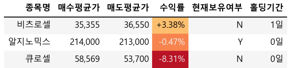오늘 아침 나스닥이 급등한 것을 확인하고 고민에 빠졌다. 생각을 해보니, 비츠로셀은 전쟁 수혜주… 굳이 나누자면 그렇다는 것. 따라서 적당한 수익에 매도하고, 보다 공격적인 종목을 매수해야겠다고 생각했다. 큐로셀은 1% 비중으로 샀는데 전고점을 돌파 못하는 것 같아 손절…