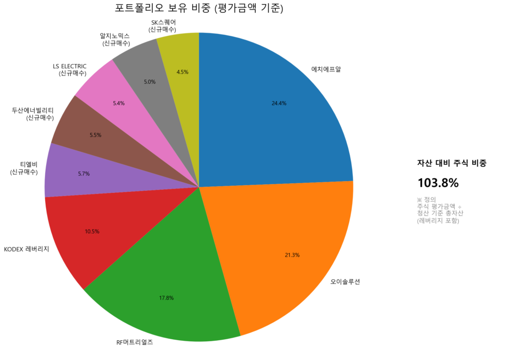 비츠로셀을 매도하고 그 자금으로 매수한 종목은 티엘비, 두산에너빌리티, LS ELECTRIC, 알지노믹스, SK스퀘어다. 나름 분산을 하기 위해 다양한 섹터로 매수했다. 신고가는 아니었기 때문에 큰 비중으로는 매수하지 못했고, 적절히 나눠서 매수했다. 그리고 주식 비중은 103.8%로 다시 증가했다. 앞으로 상승장이 이어진다는 가정 하에 주식 비중을 늘린 것인데, 어떻게 될 지는 모르겠다. 만약 다시 한 번 변동성이 큰 횡보장이 나온다면…? 그래도 매수평단가가 모두 좋기 때문에 조금 버텨봐도 좋을 상태다.