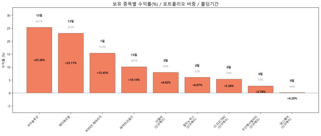 두번째로 큰 비중을 가진 오이솔루션이 거의 상한가에 마감했다. 에치에프알도 상한가를 두 번 터치했으나 수익 실현 매물이 많아 상한가를 닫진 못했다. 그럼에도 두 종목의 활약으로 계좌의 수익률이 크게 좋아질 수 있었다. KODEX 레버리지도 꽤나 큰 도움이 됐다. 아쉬운 점은 RF머트리얼즈인데, 미장에서 LITE가 크게 가주지 못하면서 LITE와 거의 비슷한 움직임을 보여주던 RF머트리얼즈가 상대적으로 언더퍼폼했다. 나머지 종목들도 매수 단가가 낮아 플러스 수익을 기록 중이다.