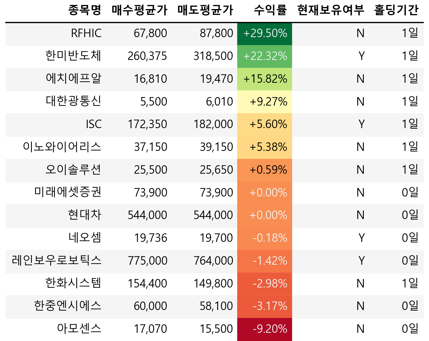 잡다하게 1주씩 매수했다가 매도한게 많아 헷갈릴 수 있지만, 실제로 의미있게 매매한 종목은 몇 안된다. RFHIC는 오늘 삼성전자와 NVDA의 협력 소식 및 AT&T의 투자 소식에 통신주들이 급등하며 동반 상승하여 매도했다. 등락률로 보면 통신주 중 거의 7등주로써, 내일 조정 받을 가능성이 매우 높다고 생각했다. 어제 0.5% 정도의 비중으로 매수했던 에치에프알, 대한광통신, 이노와이어리스, 오이솔루션 등을 시초가 근처에 매도해서 정리했다. 이렇게까지 큰 상승을 줄 지는 몰랐다.
