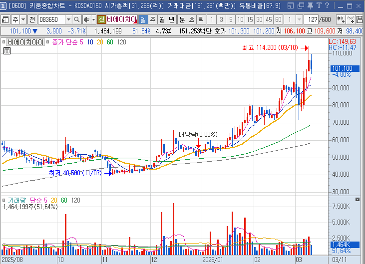 로킷헬스케어를 큰 비중으로 매수했다. 펀더멘털도 매우 좋고, 주가의 상승 후 기간조정 그리고 재돌파의 전형적인 패턴이었기 때문이다. 그 외로 조정 중인 레인보우로보틱스를 매수했고, 비에이치아이는 급등 초반의 조정 패턴으로 급등하는 종목은 하루 조정에 매수한다는 원칙으로 매수했다. 차트를 보면 아래와 같다.