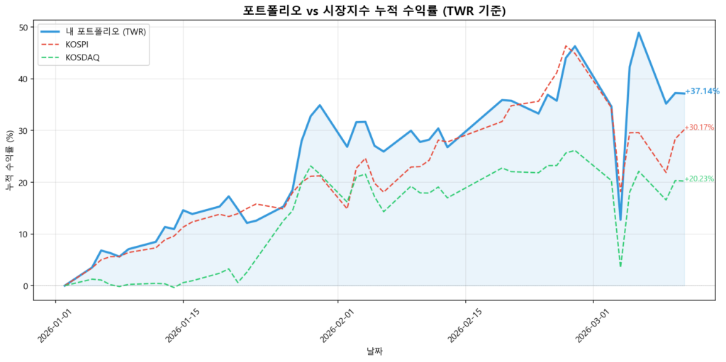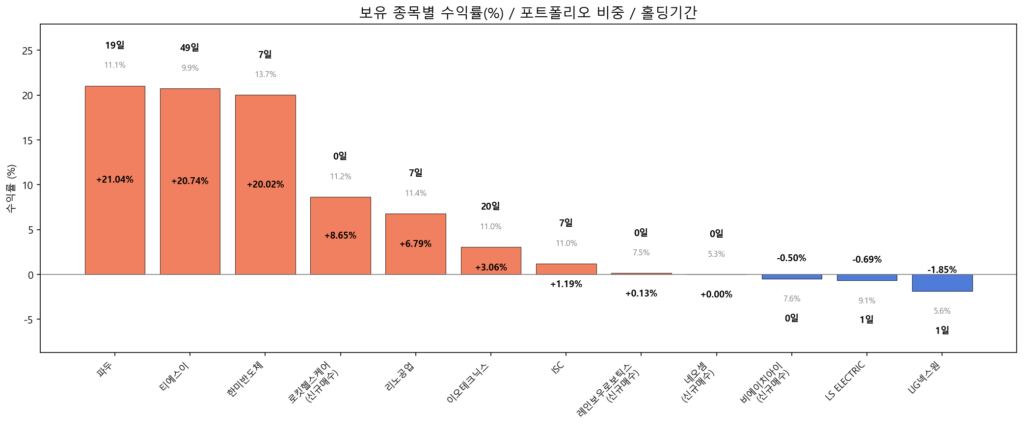 한미반도체와 ISC의 비중이 꽤 컸는데, 오늘 흐름이 좋지 못해 지수보다 약간 언더퍼폼 했던 것 같다.