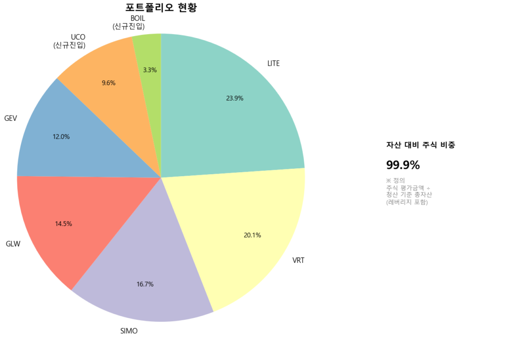 운이 좋게도 엔비디아의 지분투자 소식에 LITE가 크게 상승해줬다. 덕분에 어려운 시장에서도 포트폴리오 자산이 상승했다. AAOI를 놓친 것은 정말 아쉽지만, 내 것이 아니었다고 생각한다. 그렇게 열심히 펀더멘털을 찾아보지도 않고, 대충 대충 큰 그림만 보고 추세추종을 하고 있기 때문이다. 오늘 아침 미장의 종가 기준으로는 아직 BOIL과 UCO 모두 손실 중이다.