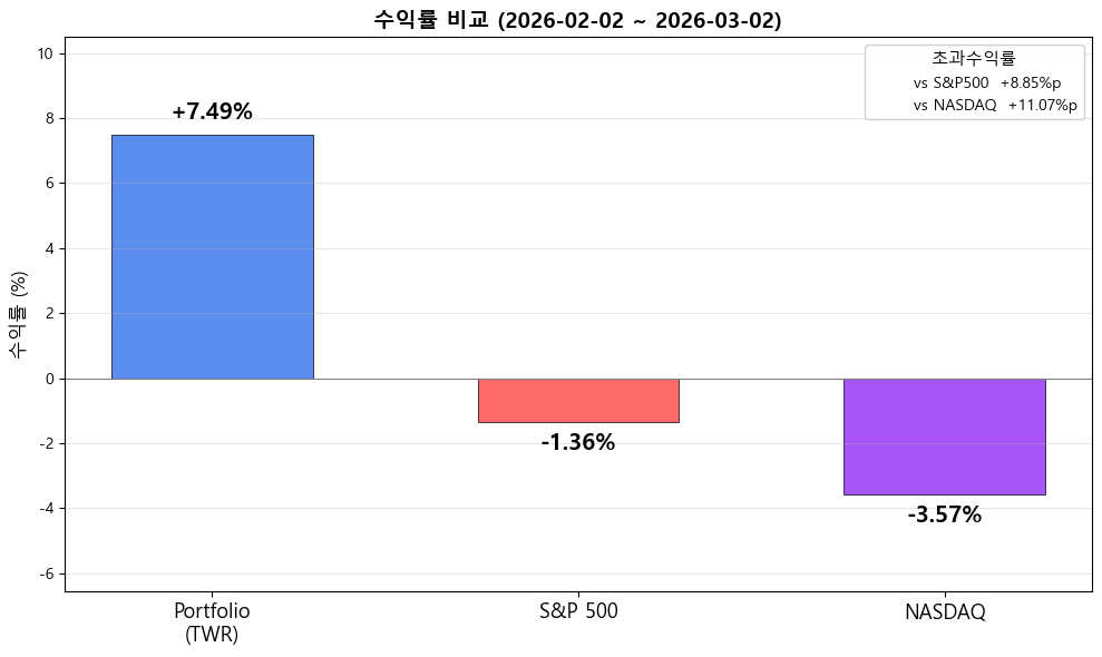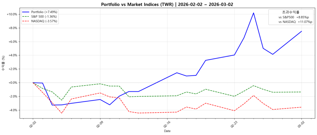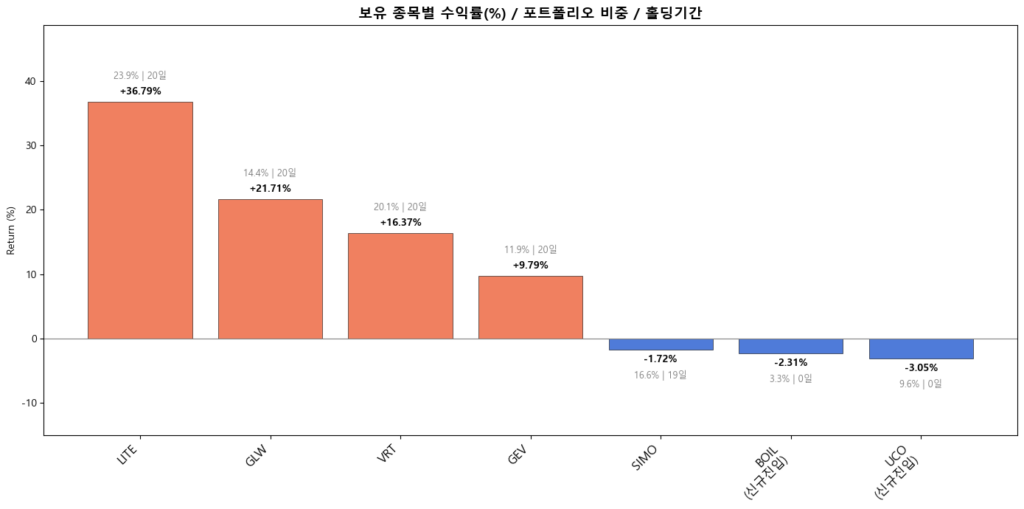포트 수익률 표를 보면 약간 내 포트 수익률이 과대평가 되는 것 같다. 아마 코딩에 문제가 있는 것 같은데 다시 수정할 계획. 아마 +7.49%는 아니고, +6%정도 되는 것 같다. 아무튼 S&P500과 NASDAQ INDEX에 비해 훨씬 아웃퍼폼하고 있다. LITE 덕분이다.