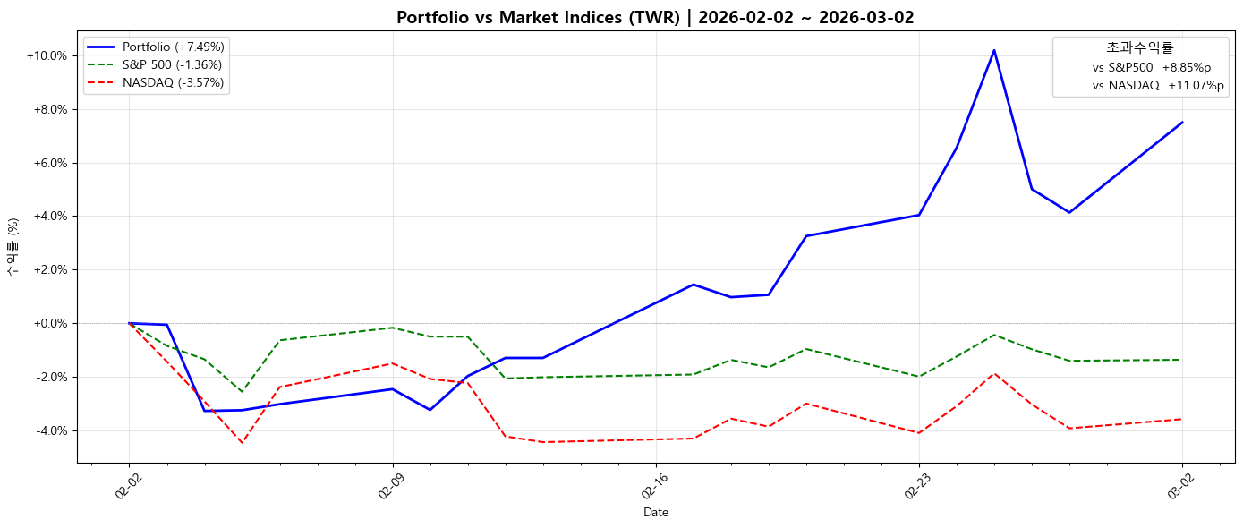 포트 수익률 표를 보면 약간 내 포트 수익률이 과대평가 되는 것 같다. 아마 코딩에 문제가 있는 것 같은데 다시 수정할 계획. 아마 +7.49%는 아니고, +6%정도 되는 것 같다. 아무튼 S&P500과 NASDAQ INDEX에 비해 훨씬 아웃퍼폼하고 있다. LITE 덕분이다.