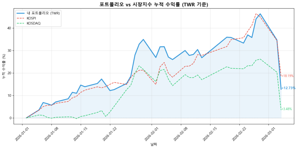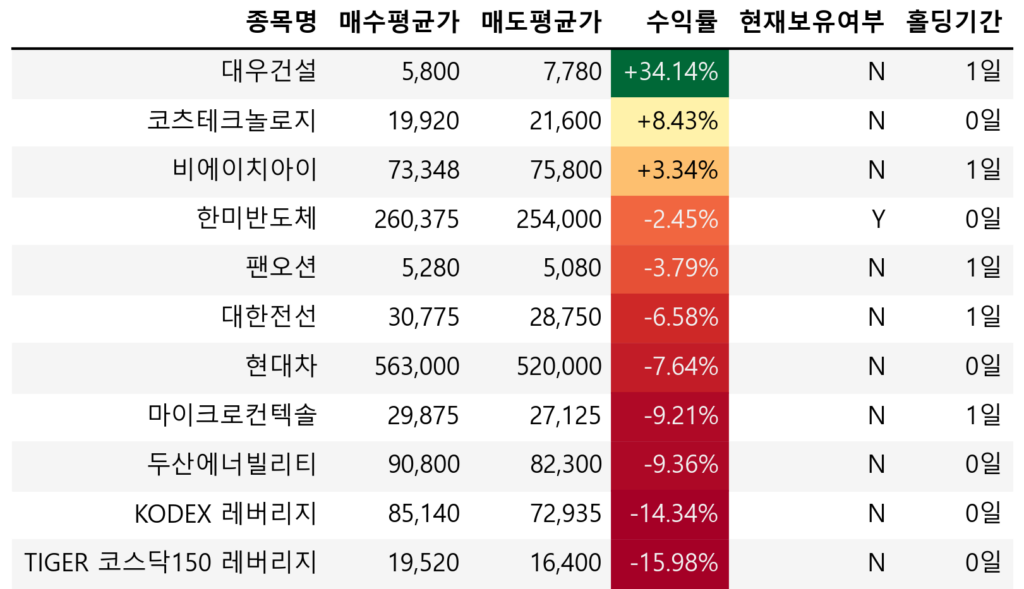어설프게 진입했던 레버리지 종목을 처분했다. 현대차와 두산에너빌리티도 -1R을 초과하여 매도했고 대한전선도 마찬가지. 팬오션도 수익에서 손실로 전환되어 적당히 매도했다. 비에이치아이와 대우건설은 추세가 무너지는 양상이라 적당히 익절했다.