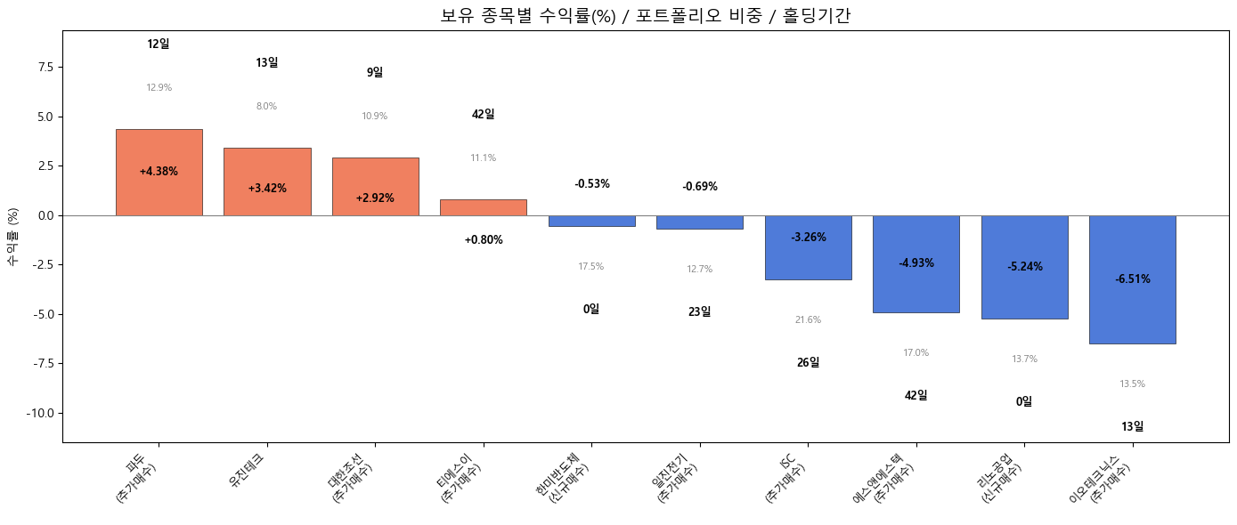 LNG선에 대한 매력도 상승으로 대한조선도 추가로 매수하여 포트폴리오를 소수 종목에 집중하게 되었다. 그러나 -7%를 1R로 설정하는 것과 MAX 2% RULE은 동일하다.