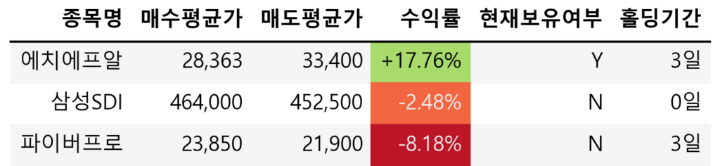 오늘은 금요일 추가로 불타기했던 에치에프알의 물량 일부를 매도했다. 아쉽지만 파이버프로는 -8%에 도달하여 매도할 수 밖에 없었다. 삼성SDI는 신고가에 도달하면 매수하기 위해 1주만 매수했었는데, 신고가를 가는듯하다가 밀려서 매도했다.