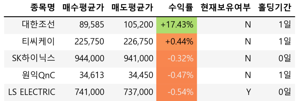 장기투자 계좌에서도 보유중이었던 대한조선을 유가 하락이 깊어질 것으로 판단하여 매도했다. 전쟁은 지속되더라도 유가는 하락할 수 있다고 생각했다. 그리고 지난 번 매수했으나 오늘 반도체 섹터에서 유독 약했던 원익QnC와 티씨케이를 매수 하루만에 매도했다.