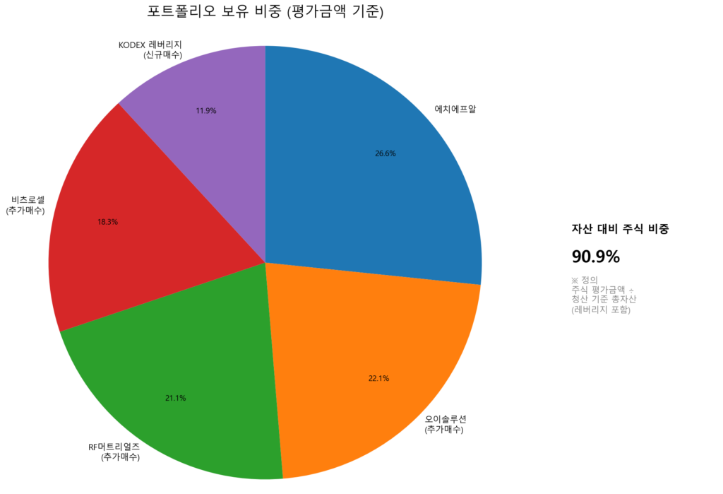 손절한 자금으로 RF머트리얼즈, 오이솔루션, 비츠로셀을 추가 매수했다. 그리고 코덱스 레버리지를 추가로 매수했다. 곧 저점일 가능성이 높다고 판단했기 때문이다. 그렇기에 확보한 현금으로 가장 추세가 덜 훼손된 섹터인 광학 섹터의 종목을 여럿 매수했다.