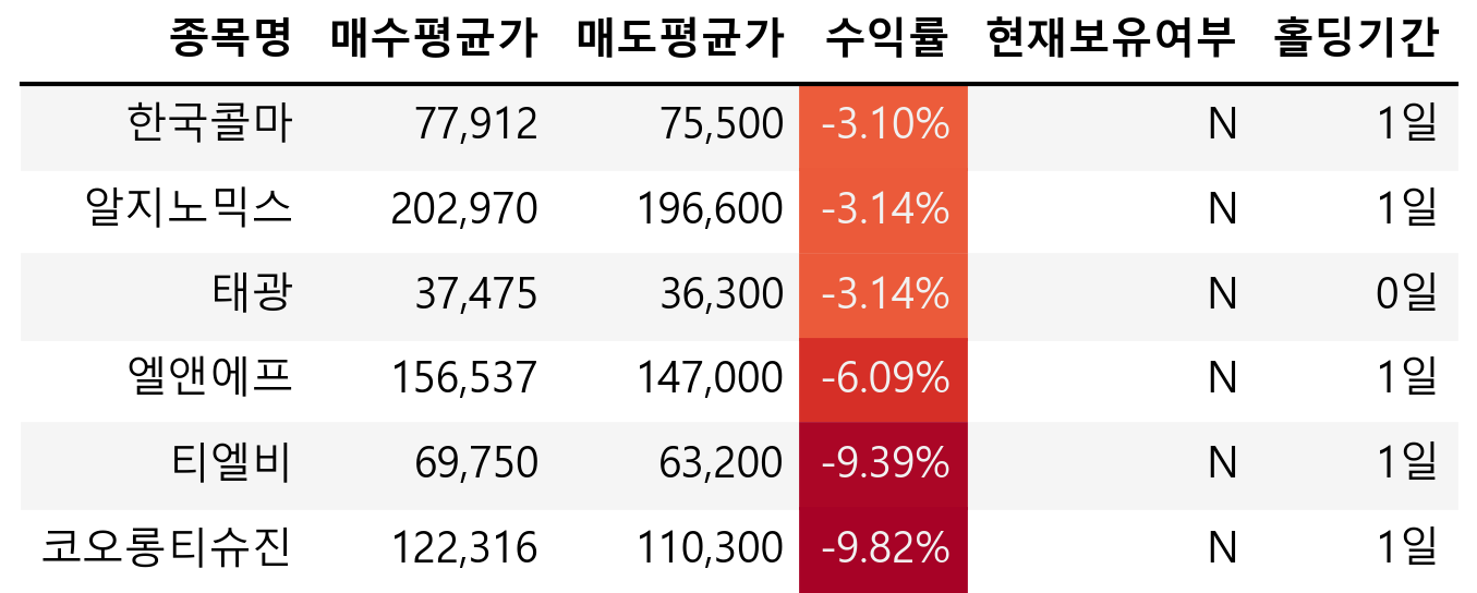 하락한 종목의 경우 -7% 정도에서 모두 손절했다. 한국콜마도 오늘도 하락하는 모습을 보며 -7%에 도달하진 않았지만 이전 장대양봉을 어느 정도 훼손했기 때문에 손절 처리했다. 알지노믹스는 보호예수 해제 이슈가 있었는데 생각지도 못했다. 다음엔 신규주의 경우 보호예수해제일이 언제인지 꼭 기억해둬야겠다.