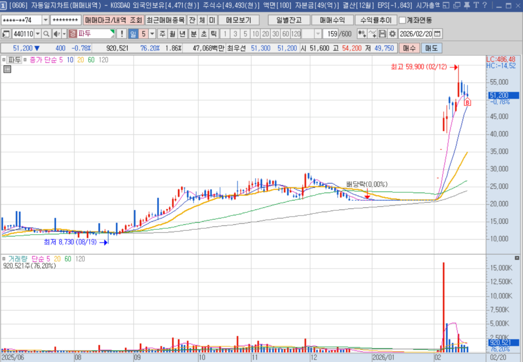 신규로는 신고가를 기록한 HD현대일렉트릭과 파두를 매수했다. 파두는 거래정지가 풀린 후 3배 급등했고 이후 점차 거래량이 감소하며 조정이 나오는 타이밍에 매수했다.
