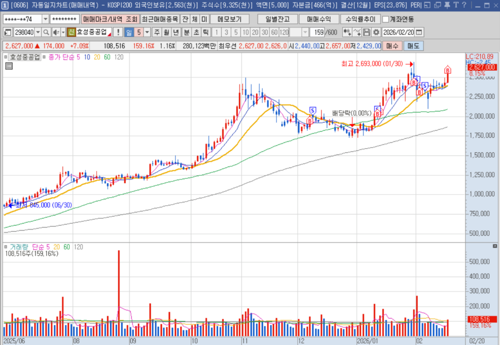 반면, HD현대일렉트릭의 경우 신고가 이후 4개월의 기간 조정이 있었기 때문에 돌파 시 매수했고, 씨엠티엑스는 IPO셋업으로 IPO 시가를 상방 돌파할 때 매수했다. 그리고 효성중공업의 불타기도 기록해볼 필요가 있다.