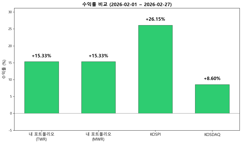 만약 펀더멘털의 개선이 확실한 삼성전자와 SK하이닉스를 기간조정 후 신고가에 대량 매수했더라면, 그리고 추세가 유지되는 한 홀딩했더라면 코스피 수익률을 따라잡거나 상회할 수 있었을 것이다. 2월 내내 삼전과 하이닉스를 거의 가지고 있지 않았음에도 얻을 수 있었던 15.33%의 수익은 나쁘지 않다고 생각한다.