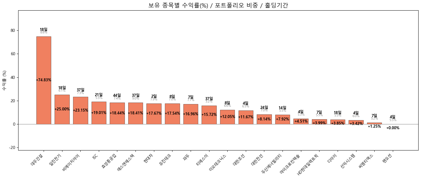정말 흥미로운 차트다. 너무 바빠서 주식에 신경을 쓰지 못했던 이번주 포트폴리오 수익률이 크게 좋아지기 시작했다. 물론, 주식 시장 자체가 상승했고 그중에서도 반도체 섹터가 상승한 덕이 가장 크다. 그렇다해도 수, 목, 금 활발하게 매매했다고 가정하면 결국 포트내의 다른 섹터 비중이 커졌을 것이고 이번주 후반부에 나왔던 큰 상승을 온전히 먹지 못했을 것이다.