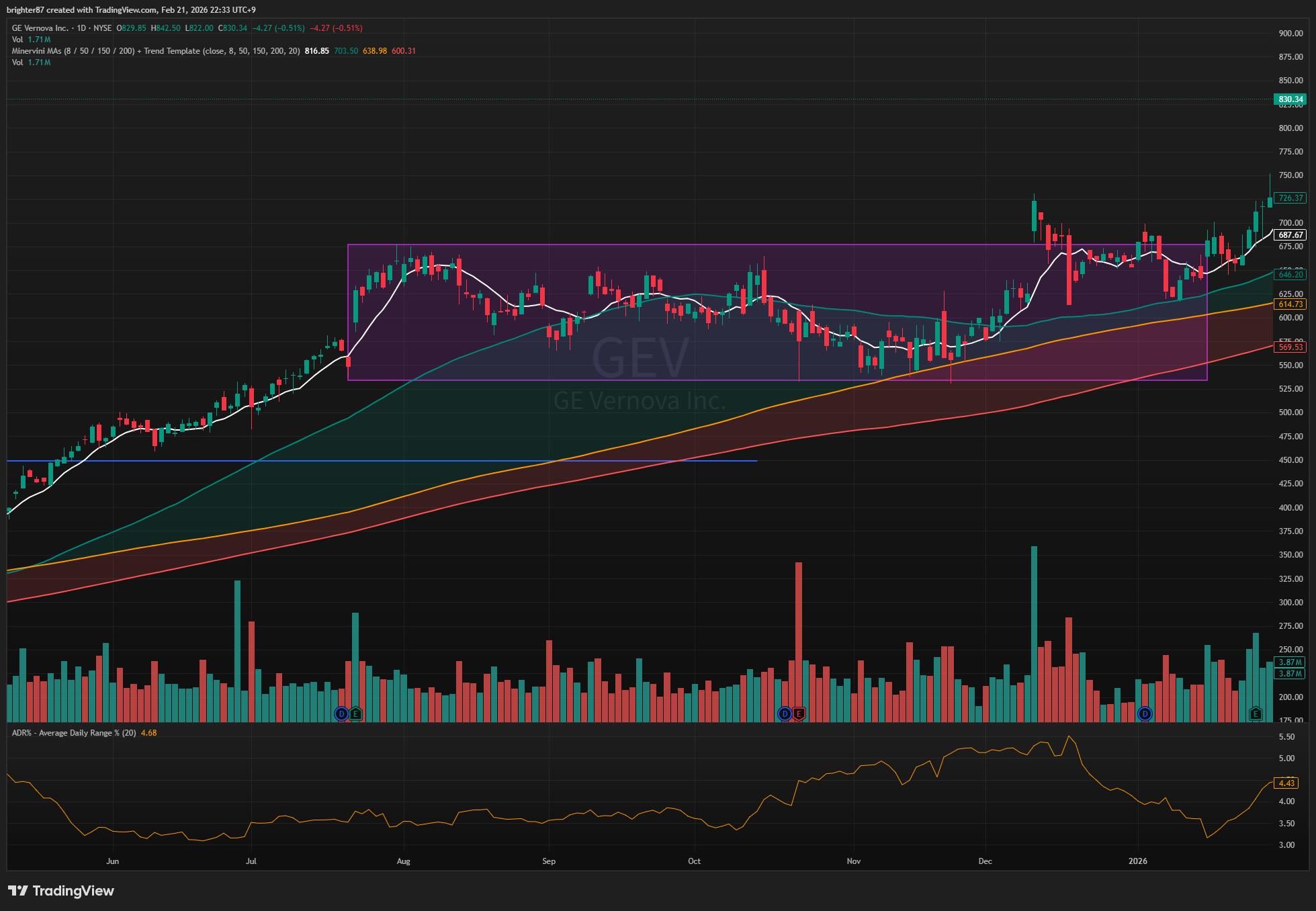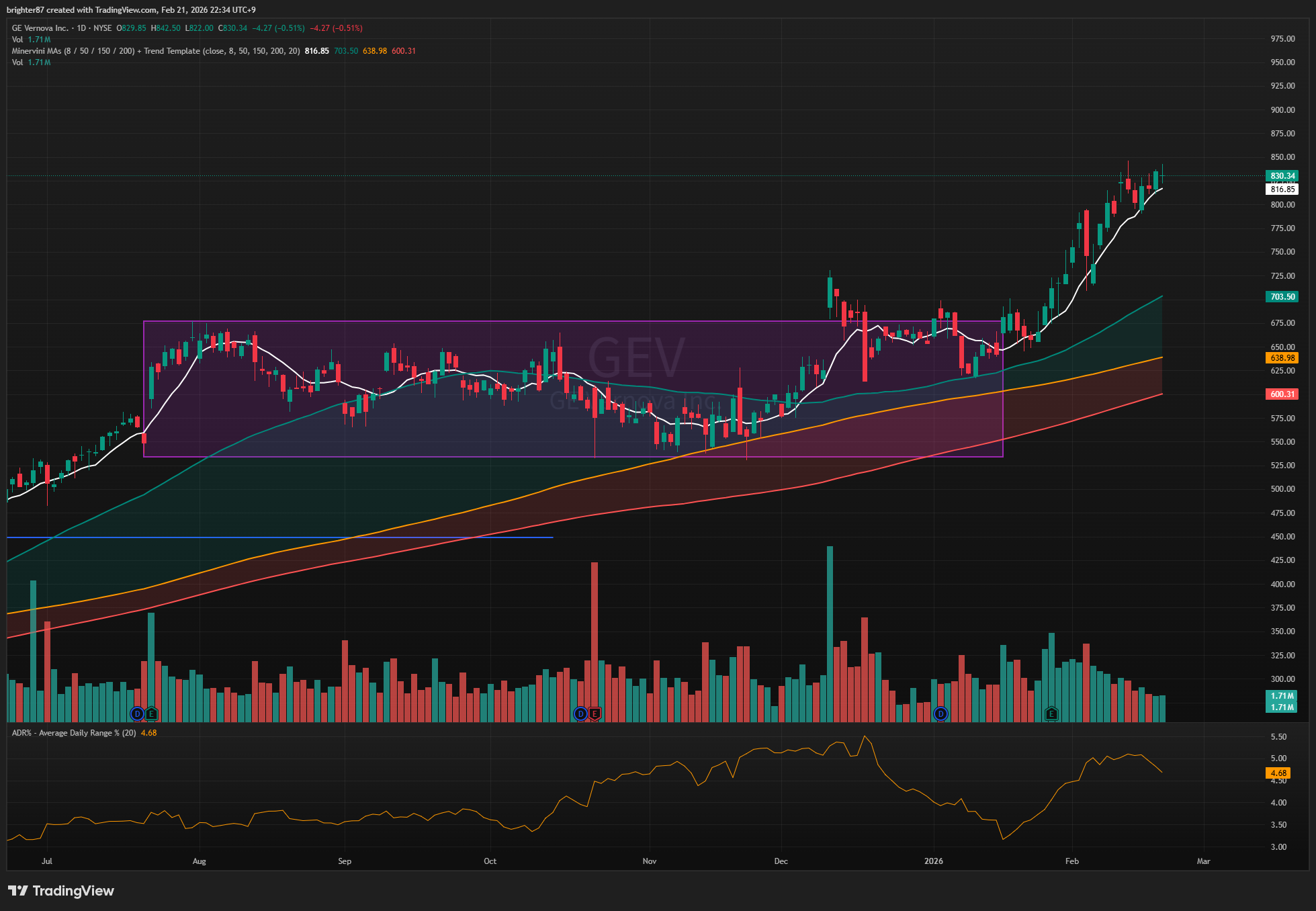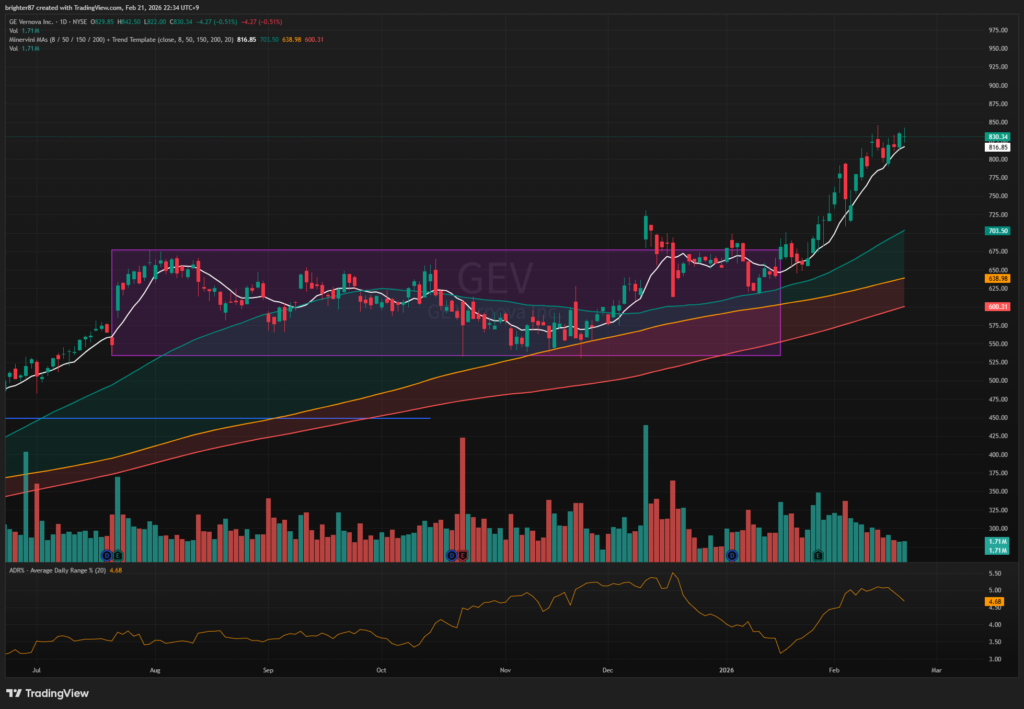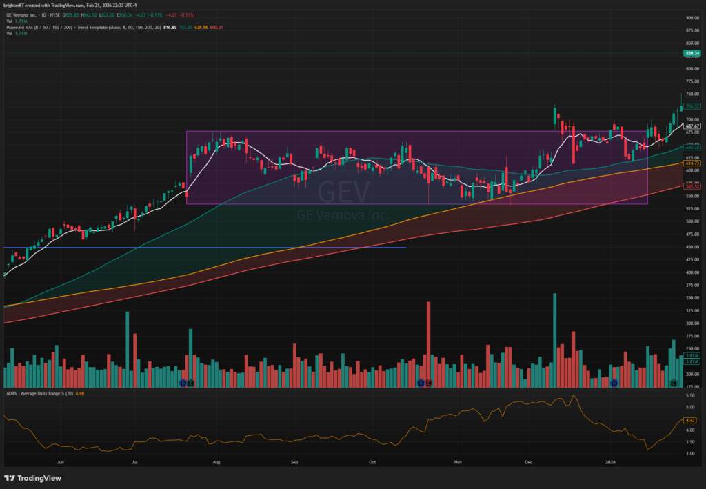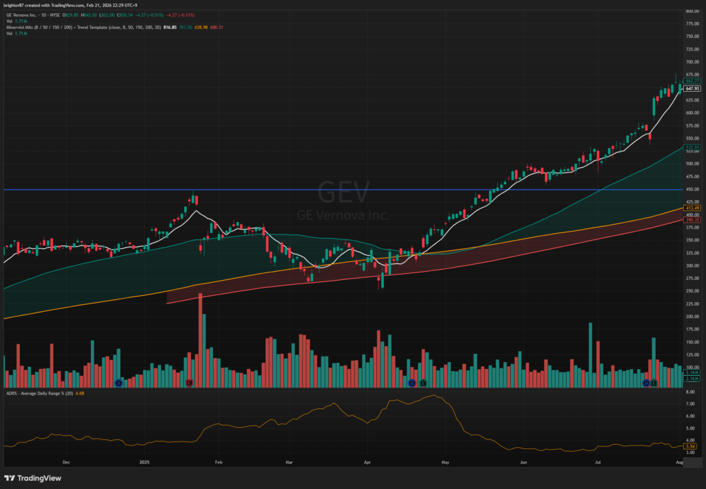 위 그림은 단순히 GEV에서만 나타난 패턴은 아니며, 어떤 상승 종목에서나 나타나는 패턴이다. 이것을 미루어 보면 두 가지 패턴을 확인할 수 있다. 강력한 펀더멘털이 유지된다는 가정 하에, 1. 상승기에 있는 종목은 1-2일의 단기 조정이 최적의 매수 타이밍이며, 2. 수개월의 기간 조정을 거친 종목은 기간 조정 후 발생한 돌파 때가 매수 타이밍이라는 것이다. 여기서도 핵심은 강력한 펀더멘털이다. 펀더멘털이 흔들리면 이 모든게 아무런 의미가 없다. 주식에 대한 수요가 감소하기 때문이다.