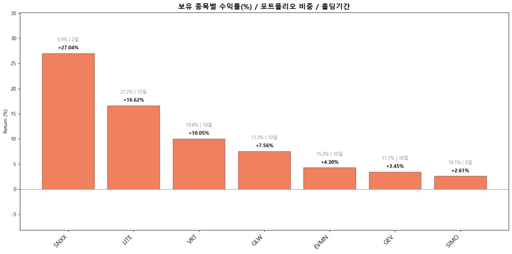 SNXX의 경우 위에 언급된 원칙대로 “우연치 않게” 매수한 종목이다. 테스트로 매우 소량, 포트 전체의 0.8%만 사봤는데 가장 좋은 성과를 내고 있어서 민망한 수준이다. 펀더멘털이 우수하고 광통신 익스포져가 가장 크며 독점력이 좋은 LITE가 역시나 가장 좋은 수익률을 보이고 있다. GLW도 광케이블 관련주 답게 지난 금요일 좋은 모습을 보여줬다.
