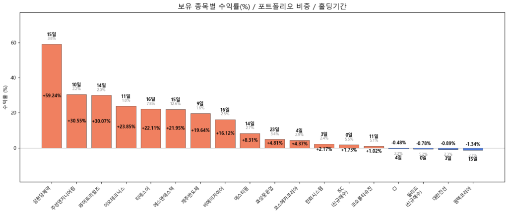 주식 비중은 여전히 적다. 55.8%다. 아직 보수적인 운영이다. 보유중인 종목들도 각 섹터마다 가장 강했던 친구들로만 남겨두었다.